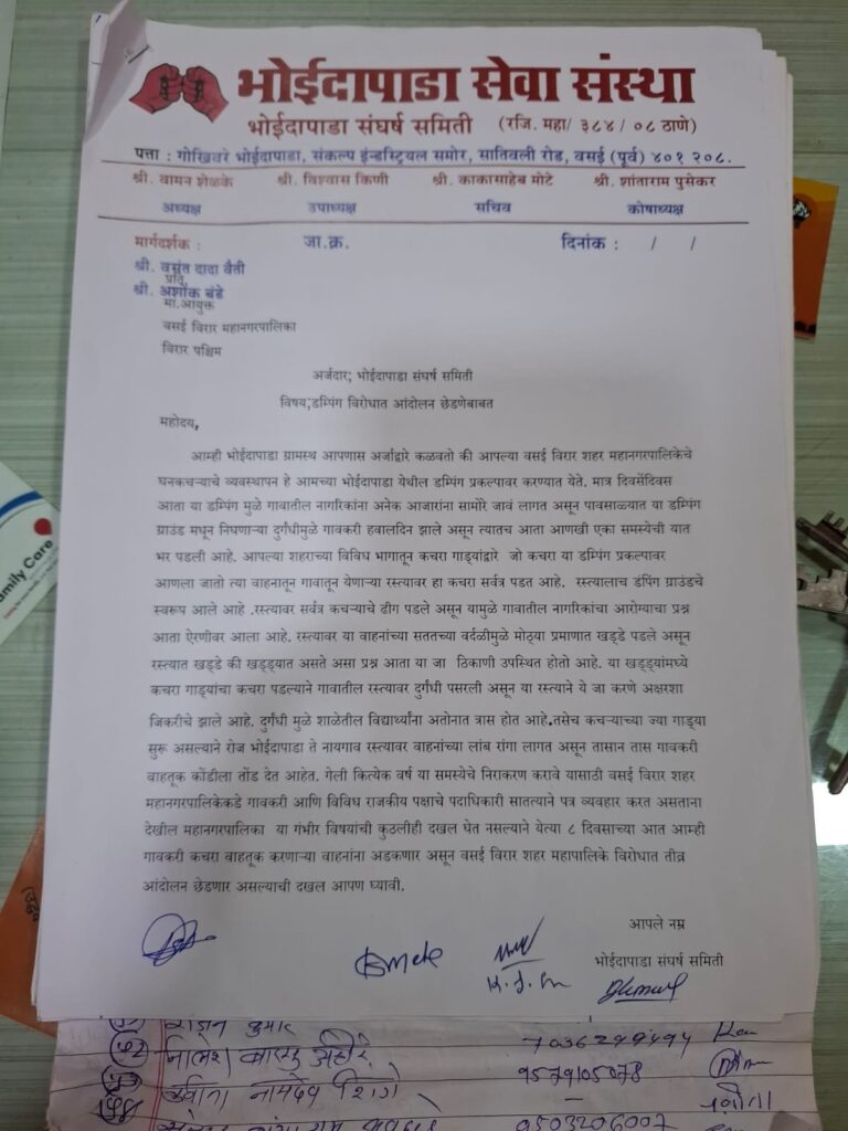 महापालिकेचा हा हलगर्जीपणा पाहून भोईदापाडा संघर्ष समितीने आंदोलनाचा इशारा दिला आहे. समितीचे उपाध्यक्ष विश्वास किणी, सचिव काकासाहेब मोटे, कोषाध्यक्ष शांताराम पुसेकर आणि मार्गदर्शक अशोक बंडे यांनी ग्रामस्थांची बैठक घेऊन आंदोलनावर सहमती घेतली. समितीचा निर्णय असा आहे की, जर मनपाने ८ दिवसांत उपाय केले नाहीत, तर गावकरी कचरा वाहणाऱ्या गाड्या थांबवतील.